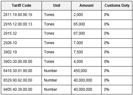A tariff quota has been imposed on certain chemicals and electronic appliances from 1 January 2016 by Council of Ministers' Decree number 2016/8435.
