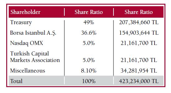 Initially, the Treasury held 49% of the stakes at the Company, whereas the Company itself held 51% of the stakes. Upon the registration and announcement of the articles of association of the Company, 4% of the capital was transferred to the existing members of the Istanbul Stock Exchange, 0.3% was transferred to the existing members of the Istanbul Gold Exchange equally and free of charge. Borsa Istanbul currently has 199 shareholders and its shareholding structure is as follows: