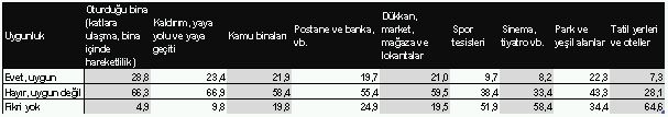 Uygunluğu bir kenara koydum, engelliler tarafından spor tesisleri, sinema, park ve yeşil alan ile tatil yerlerinin engellilerin erişimine uygun olup olmadığına dair fikri dahi yok (Örn. Tatil yerleri ve oteller %64,6), nedeni ise çok basit çünkü engelliler bu yerlere gidemiyor. Ara sıra engellilere yönelik köklü çözümlerden uzak ve ne saikle yapıldığı belli olmayan çeşitli organizasyonlar yapılarak engelli kişiler tatil yerleri ve otellere götürülmekte ve bu yapılanlarda sanki aya füze fırlatılmış gibi sosyal medya araçları dahil çeşitli medya araçları ile şov haline dönüştürülmektedir.