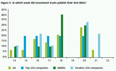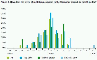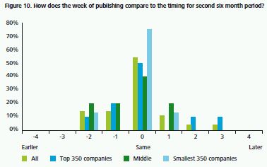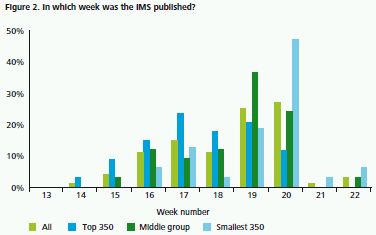 Figure 2 below illustrates in which week, since the start of the six month period, companies published their first half IMSs. As expected and in line with the findings of the previous surveys, the top 350 group of companies typically reported slightly earlier than the middle group and the smallest 350 companies.