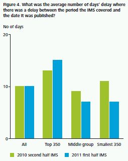 As shown in Figure 4, the average delay between the reported date in the IMS and the date of publication was 10 days (second half IMSs: 11 days) with the maximum delay being 62 days (second half IMSs: 49 days). These figures are primarily attributable to those IMSs that cover the first quarter period and they show a slight deterioration from Deloitte's 2010 survey of the second half IMSs, albeit the result is consistent with the 2009 survey on first half IMSs.