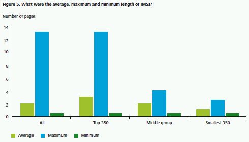 Based on the information as published on the RIS, the first half IMSs are, on average, 2 pages which is an increase from 1.7 pages for first half IMSs in 2009 (second half IMSs: 2.2 pages). The IMSs ranged from half a page to 13 pages. Figure 5 shows the average, maximum and minimum number of pages of an IMS by size of company. As expected and consistent with previous surveys, the top 350 group of companies produced the longest statements.