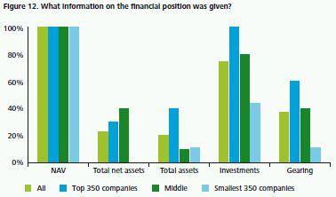 All IMSs contained some information regarding the trusts' financial position in the form of NAV. 76% of the trusts (second half IMSs: 77%) went on to provide a general description of the financial position of the trust. This type of information ranged from a single figure for total net assets to many balance sheet line items being disclosed in addition to information on gearing. Figure 12 below shows some of the frequently disclosed measures of financial position.