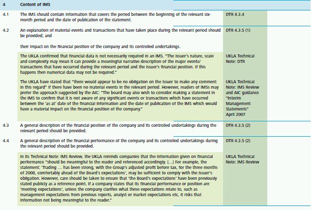 The rules do not specifically require an IMS to contain any numerical data. The Technical Note: DTR also clarified this point, stating that: "We believe that IMS may not require financial data in certain circumstances. The issuer's nature, scale and complexity may mean it can provide a meaningful narrative description of the major events/transactions that have occurred during the relevant period and the issuer's financial position. If this happens numerical data may not be required." In its Technical Note: IMS Review, the UKLA stated further that it "envisaged that the use of financial data was likely to be the main approach". However, despite this flexible attitude, the UKLA's own findings highlighted that many companies failed "to provide adequate coverage in either narrative or data".