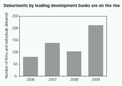 The Macmillan debarment is part of a surge in sanctions measures by the banks. In the World Bank's combined 2007 and 2008 fiscal years, for example, it debarred only two companies. In the past two years, it has debarred nearly 60 firms and individuals. In the same time, the Inter-American Development Bank has doubled its number of debarments, while the Asian Development Bank also has increased its debarments (see chart).