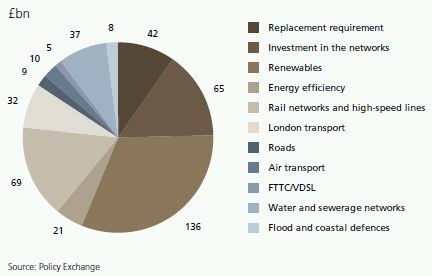 There are several keys areas where there is a consensus on the requirement for greater investment, including energy, public utilities, transport and telecoms. All sectors are faced with the need both to renew ageing existing infrastructure and to invest to deal with anticipated future pressures deriving from social, demographic and climate changes. To take energy as an example: this includes the generation, distribution and supply of electricity and gas. Earlier this year, Alistair Buchanan, the chief executive of Ofgem, the UK's energy regulator, said the sector required new investment of 'up to £200bn'.6 He hinted that there was a danger of the lights going out if radical reform was not undertaken. He told The Guardian newspaper: 'To wait a few more years [without doing anything] could cause us trouble. We would get down to historically low levels of margins of plant, to when you are starting to ask if you have enough power stations.'7