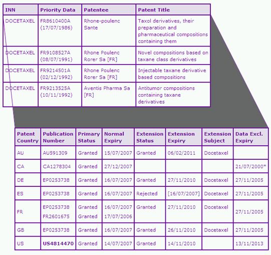 The Docetaxel Key Patent Indicator (KPI) (Table 2) identifies four patent families as being of significant commercial relevance to the Taxotere products. The patent family with priority number FR8610400A protects the Docetaxel molecule per se. The patent expiry data for this family shows that the Docetaxel molecule firstly lost protection in Spain in 2007 due to a rejection of a Supplementary Protection Certificate (SPC) application. Canadian patent protection for the Docetaxel molecule also ended in 2007 as the normal term expired, and there is no patent term extension provisions in Canada. In contrast, the US and other major European equivalents have longer patent protection due to granted PTE or SPCs in these jurisdictions. Patent, US4814470 expired last month after the term of the 6 month paediatric extension, in addition to the USC section 156 PTE of 1035 days. SPCs on the European equivalents in this family also expired last month in major territories. Similarly, a section 70 PTE in Australia allows the Docetaxel molecule patent to be in force until February 2011 due to a later TGA approval date.