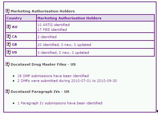 The Pipeline Selector report also discloses marketing authorisations in relation to the Docetaxel product in certain countries, both branded and generic (Table 3). It can be seen from the news articles that Actavis and other generic companies have started to sell generic Docetaxel single vial products in Europe. Limited investigation shows that these formulations contain higher levels of ethanol and therefore circumvent the key formulation patents. Several other generic manufactures also obtained market authorisations for their generic Docetaxel products in European countries. In Australia, Interpharm has obtained marketing authorisation for a generic Docetaxel product. Interestingly, no generic Docetaxel is identified as available in Canada. Presumably, the litigation case around CA2150576, CA2102777 and CA2102778 has resulted in an extended monopoly of the Taxotere product in this market. Generic Docetaxel products are not yet available in the US market however, several tentative approvals have been identified and a total of 18 Drug Master Files (DMF) in relation to Docetaxel have been filed, suggesting that this product will go generic once any outstanding litigation has been dealt with.