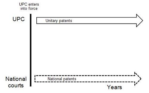 Disputes concerning national patents will continue to be heard only in the national courts – this will not change in the new system. In contrast, Unitary Patents will only be actionable in the UPC, as regards matters within the UPC's 'exclusive' competence. This includes the key areas of revocation, enforcement (including injunctions) and non-infringement declarations. These two jurisdictions are represented in Figure 2. Here, the arrow at the top of the figure illustrates Unitary Patent actions taking place exclusively in the UPC over time. The broken-outline arrow at the bottom of Figure 2 shows national patent actions taking place exclusively in the national courts over time.