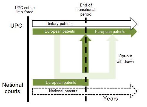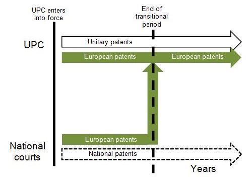 Figure 3. Jurisdiction for European patent actions during and after the transitional period.