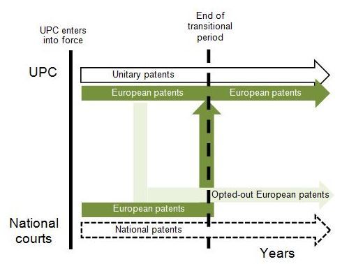 All European patents will eventually be subject to the exclusive jurisdiction of the UPC. However, a period of adjustment – a transitional period – will operate first, in which patentees have some control over whether their patents are subject to potential actions in the UPC. This period will initially last for 7 years, although it may later be extended by a further seven years. Figure 3 develops the picture of jurisdiction over time shown in Figure 2 by adding European patents. During the seven-year transitional period, European patents can be litigated in either the UPC forum (top, dark green arrow) or the national courts of their designation (bottom, dark green arrow). However, once the transitional period has expired (shown by the vertical dotted line) all disputes about matters within the UPC's exclusive competence concerning European patents must be started in the UPC and the UPC only. Actions already started in a national court must continue in the national court. Furthermore, during the seven year transitional period, the proprietor (or applicant) for a European patent may opt-out that patent from the exclusive competence of the UPC. However, if an action relating to the patent has already been filed in the UPC, the opt-out is barred. There is also a right to withdraw an opt-out (discussed below).