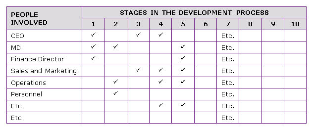 In order to help people to be supportive, it is worthwhile preparing a grid of who will be involved and when their involvement will be important to the development process. Most people are reluctant to rubbish an idea, if some time later they may have the responsibility for its success.