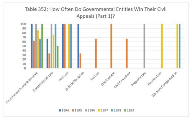 In 1999, governmental entities won both their cases in government and administrative law. They won half their cases in constitutional law, and lost their one tax law case.