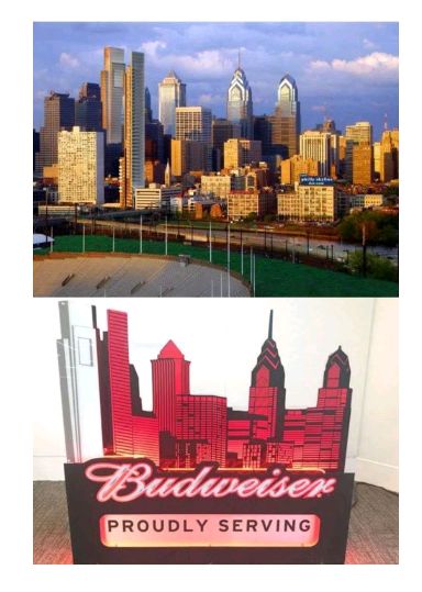 Anheuser Busch (the defendant) created the neon pub sign depicting an outline of the Philly skyline seen in the bottom image accompanying this post. According to the complaint, this sign graced the windows and walls of at least 20 watering holes in Philly. When Maule saw the sign in 2015, he noticed that it included the very same "ghost" building, in the very same position, as in his photo. ("Gotcha!") He promptly sued Anheuser Busch for copyright infringement.