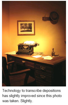 Technology to transcribe depositions has slightly improved since this photo was taken. Slightly.