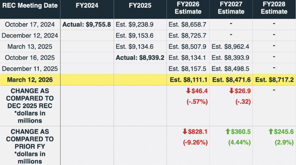FY 2026 (began July 1, 2025): Thursday's REC estimate for FY26 is lower than the December 2025 REC estimate by $46.4 million. The REC now estimates net receipts for FY26 will be $8,111.1 billion, which is $828.1 million (-9.1%) less than FY25 actual revenues.