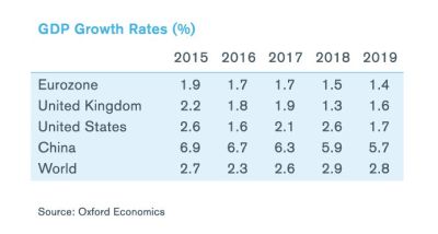 Turning to Europe, current indicators suggest some moderate strengthening. This is most apparent in Eastern Europe, where growth continues at a sustained pace. Some slowdown is possible in the UK, following the real income erosion induced by the pound's depreciation, but this is unlikely to be major. As for the Eurozone, the spectre of deflation seems to have been exorcised. Core inflation remains low, but it is no longer negative. Surveys of expectations in the manufacturing sector have shown increasing buoyancy (even if consumer confidence remains relatively subdued). Bank lending to companies continues to expand at a moderate pace. All in all, the outlook is becoming more positive and the area should grow at some 1½ per cent per annum over this year and next, with Spain and, possibly, Germany doing significantly better and Italy somewhat worse, in line with developments over the recent past. This is hardly spectacular, but still an improvement on the ½ per cent annual growth recorded between 2010 and 2016 (excluding 2015, when growth was artificially boosted by Ireland's 26 per cent rate of expansion).