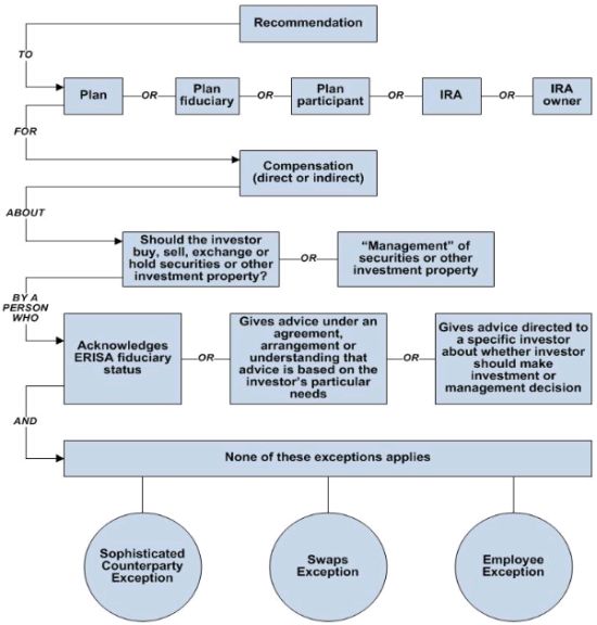 - Swaps Exception: Communications from certain swap and securities-based swap parties interacting with ERISA plans are exempt from the rule if the swap or securities-based swap is covered under the Commodity Exchange Act or the Securities Exchange Act of 1934, the plan is represented by an independent fiduciary, and the retirement investor acknowledges that it is not relying on its counterparty for advice.
