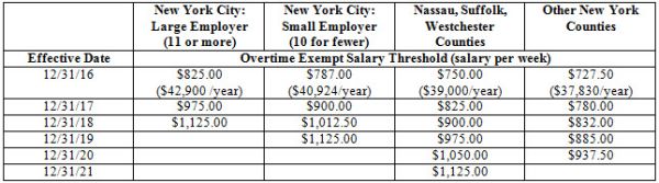 The proposed New York Wage Order increases the minimum salary requirement necessary for executive and administrative employees to be exempt from overtime. The proposed schedule of exempt salary requirements for administrative and executive employees would be as follows: