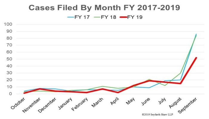 As we have come to expect, the EEOC ended its fiscal year with increased activity, filing 52 lawsuits during September alone compared to the total of 12 filings during the entire first quarter of 2019. But in the end, the agency's end-of-year rush and total number of filings did not come anywhere near the numbers posted last year. At the time of publication of this blog posting, the EEOC had filed 149 total cases in FY 2019, which includes 141 merits lawsuits and 8 subpoena enforcement actions. This total number of filings is significantly less than the last two years (see here and here), and is more in line with the drop off in filings that we saw in FY 2016 (see here).
