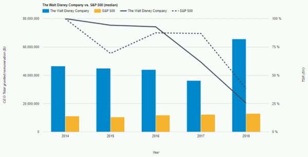 Using the same data and analytics available through the CGLytics platform, we reviewed Mr Iger's compensation in the period following his major acquisitions and the begin of the decline of Disney's TSR. This decline has mostly continued all the way through 2018, while Mr. Iger's total granted remuneration stagnating or even lowering, with 2018 serving as an outlier in terms of compensation. This upswing in total granted compensation probably reflects an increased payout to Mr. Iger following the announcement of the Disney/21CF merger, despite the downward slalom that Disney's TSR has taken since 2016.