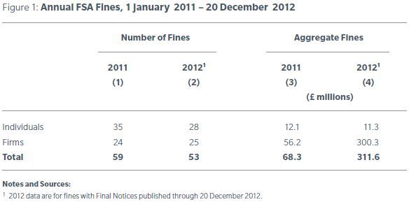 Fines imposed by the Financial Services Authority (FSA) since 1 January 2012 (through 20 December) have totalled £310 million, more than four times the total for 2011 (see Figure 1). This increase is due to a handful of very large fines, including the £160 million fine against UBS for LIBOR manipulation announced 19 December, which is the largest-ever FSA fine by a substantial margin.