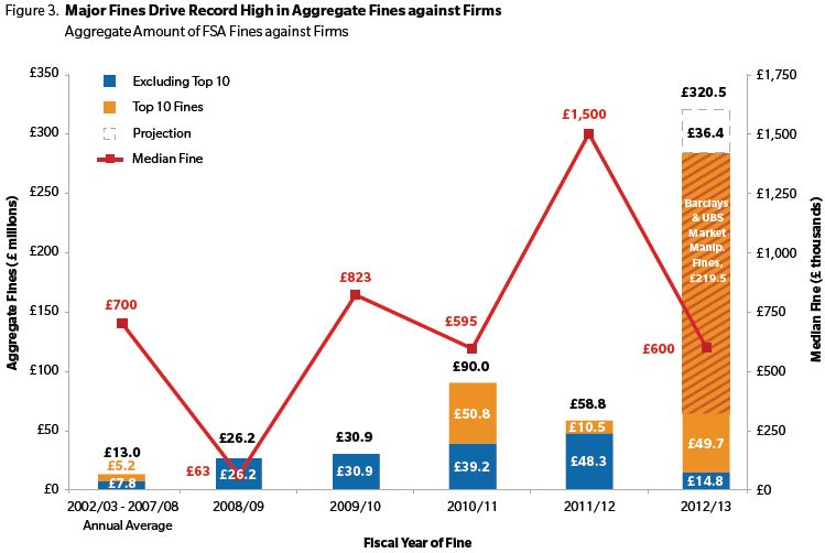 The 10 largest FSA fines of all time now include five 2012 cases against firms. The fines imposed on Barclays and UBS for interest rate manipulation were the largest of the FSA's record four fines in excess of £10 million this year; 2010, with two such fines, is the only other year which saw multiple fines of that magnitude.