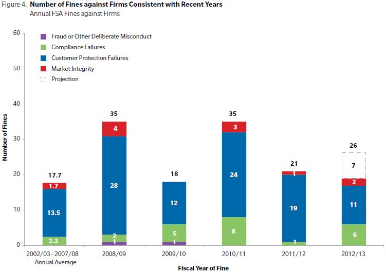 While the FSA has made waves with the very large fines, the number of fines against firms is similar to the number in recent fiscal years. The FSA has levied 19 fines in the 2012/13 fiscal year to date. At this rate, the FSA will eventually issue 26 fines against firms in 2012/13, which would just exceed the annual average of 24.7 fines against firms over the prior three fiscal years (see Figure 4).