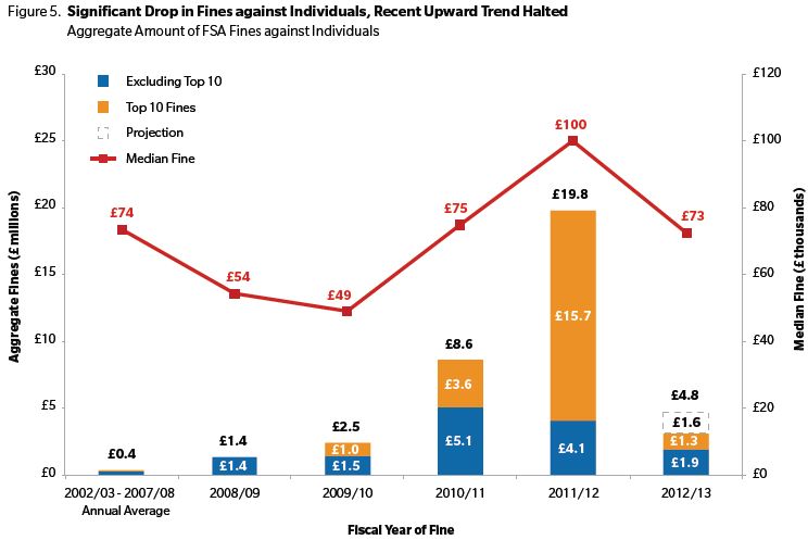 The absence of very large fines has reversed the prior pattern of year-over-year growth in aggregate fines against individuals (see Figure 5). Aggregate fines had doubled or nearly doubled every year since 2008/09—from £1.4 million in 2008/09 to nearly £20 million last year—but have totalled just £3.2 million so far in 2012/13 and are projected to reach £4.8 million.
