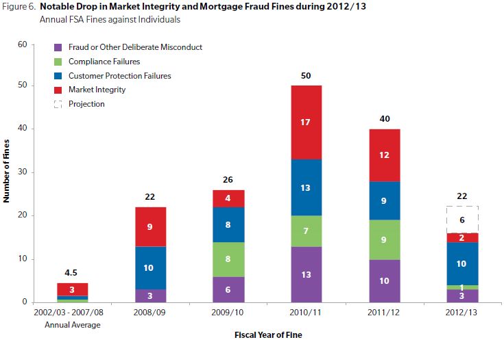 The number of fines against individuals is also on pace to fall to its lowest level since 2008/09 (see Figure 6). A combined 90 fines were levied against individuals during the previous two years, but there have been only 16 fines to date in 2012/13.