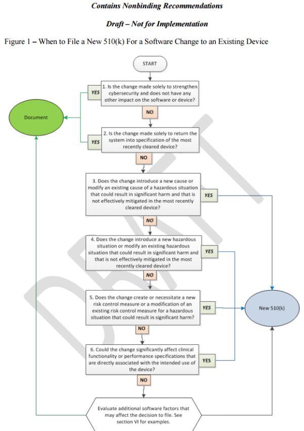 FDA's Draft Guidance provides new clarity on the types of software changes that may require manufacturers and industry to submit a new 510(k). The detailed flowchart, additional factors, and various examples offer useful insight into how companies can approach any current or future software changes. This guidance is very timely given the rapid increase and focus on mobile medical applications (MMA), health information technology (HIT), clinical decision support (CDS) software, and various other types of HIT products.