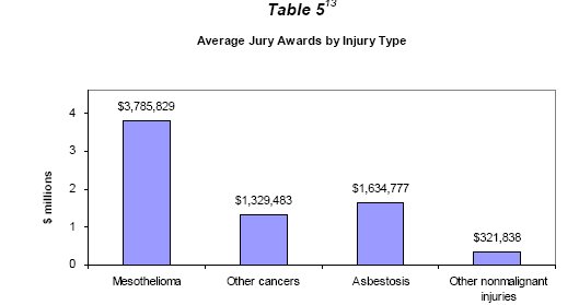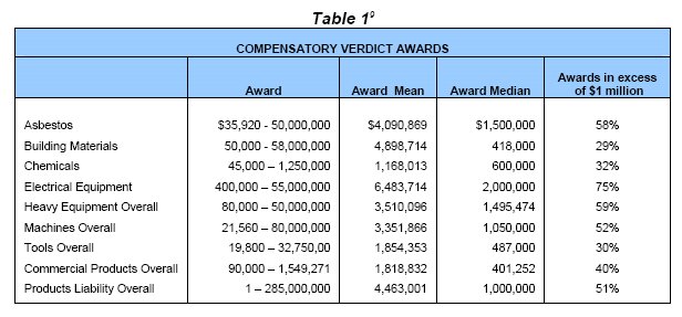 Jury Verdict Research Reports stated that in the period of time between 1995 and 2005 for all asbestos injury case/trials awards ranged $35,920 to $50 million.6 The award mean was $4,090,869 and the award medium was $1,500,000.7 Fifty-eight percent of all verdicts in asbestos injury litigation exceeded $1 million8A comparison of these results compared with the results of other product liability verdicts can be found in Table 1.