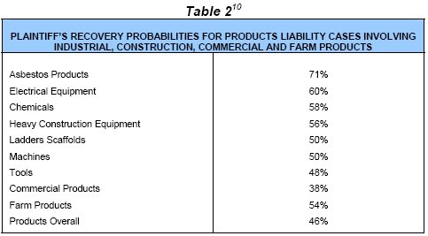 Jury Verdict Research reports that in the period 1995 to 2005 the plaintiff was successful 71% of the time in asbestos injury cases. See Table 2. When you compare that to plaintiffs' recovery probabilities in other suits, you can appreciate the attraction that this litigation presents to the plaintiffs' bar. The Rand 2005 Report further breaks plaintiffs' probability out by injury.