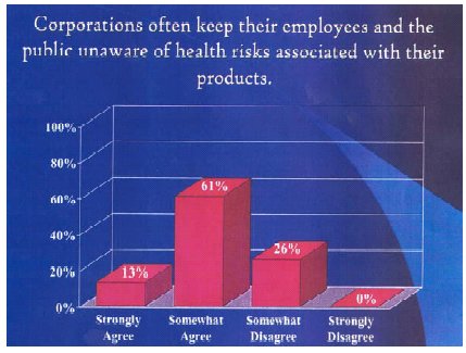 I have conducted numerous mock jury exercises to determine jurors' attitudes regarding corporations. These results are not surprising in today's culture. They clearly indicate the disadvantage any company has in trying a lawsuit against a person with a serious disease such as cancer.