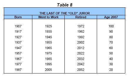 What has happened to those jurors? If you were 50 in 1979, you are 78 in 2007. Not many 78 year olds are being called for jury service and if one or two slip through, they are usually excused for medical reasons. The best candidates for jury service who would have knowledge of the history of asbestos are approaching a point where they are too old for jury service as seen in Table 8.