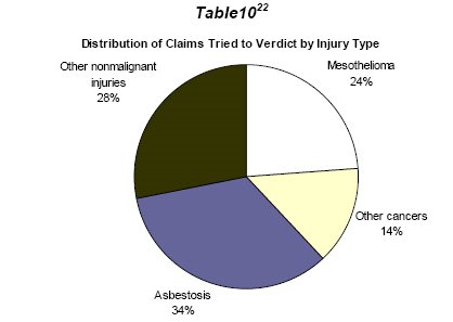Trials going to verdict are again on the rise. Table 9 shows that defendants continue to litigate these cases in the face of the overwhelming odds in plaintiffs' favor. Nearly one-half of all cases tried involve a claim for cancer (see Table 10).