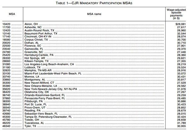 The CJR model originally became effective on April 1, 2016 and mandated that hospitals in 67 specified MSAs must participate in an episode-based payment program for hip and knee joint replacements. The Proposed Rule, anticipated to be effective as of February 1, 2018, reduces the mandatory participation in the CJR essentially by one half to 34 MSAs (see Table 1 below taken from the proposed rule for the remaining MSAs).