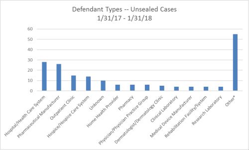 What kinds of businesses were targeted? Hospitals, pharmaceutical manufacturers, outpatient clinics, hospices and pharmacies were most frequently sued in cases unsealed over the 12-month period ended January 31, 2018.