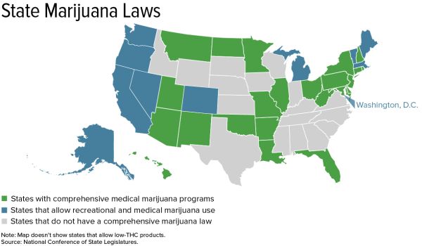 In stark contrast to federal law, 33 states and Washington, D.C., allow marijuana use for medical purposes, 10 states permit full recreational use, and a growing number of states permit medicinal use of CBD products with low THC levels.