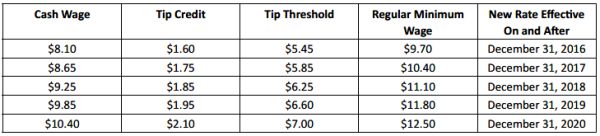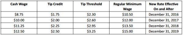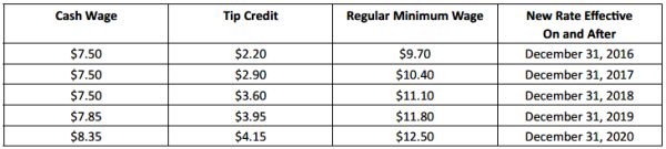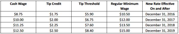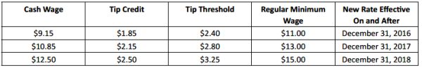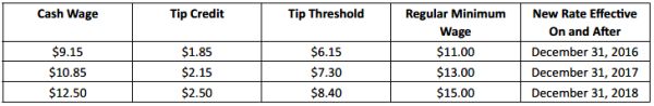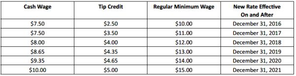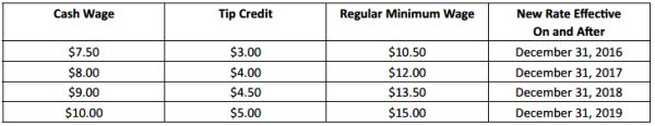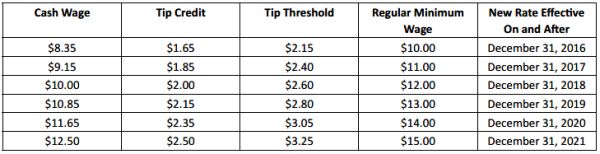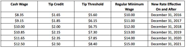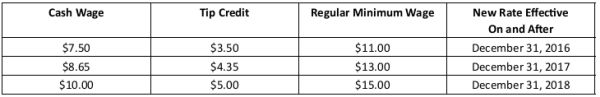 As detailed in a previous alert, on December 31, 2016, the hourly rate for "food service workers" in New York City is expected to increase to $7.50 with a $3.50 tip credit for a total of $11.00 for large employers (11 or more employees); and to $7.50 with a $3.00 tip credit for a total of $10.50 for small employers (10 or fewer employees). A "food service worker" eligible for this tip credit must be employed in a position that customarily and regularly receives tips, including but not limited to: server, busser, food runner and bartender.