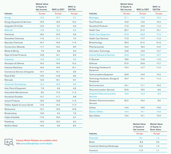 An industry must have a minimum of five company participants to be calculated. For all reported multiples in Europe, the average number of companies in the calculation sample was 90 and the median number of companies in the calculation sample was 39. Sample set includes publicly-traded companies (private companies are not included). Source: Data derived from Standard & Poor's Capital IQ databases. Reported multiples are median ratios (excluding negatives or certain outliers). MVIC = Market Value of Invested Capital = Market Value of Equity plus Book Value of Debt. EBIT = Earnings Before Interest and Taxes for latest 12 months. EBITDA = Earnings Before Interest, Taxes, Deprecia¬tion and Amortization for latest 12 months. Note that due to the exclusion of negative multiples from the analysis, the number of companies used in the computation of each of the three reported multiples across the same industry may differ, which may occasionally result in a counterintuitive relationship between those multiples (e.g. the MVIC-to-EBITDA multiple may exceed MVIC to EBIT).