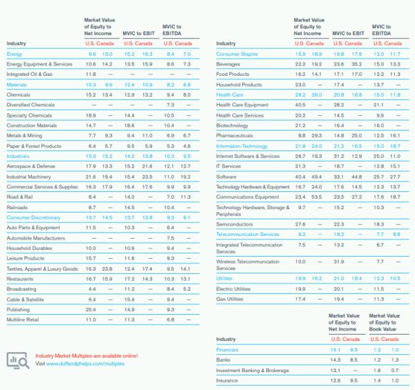 For all reported multiples in the U.S. and Canada, the average number of companies in the calculation sample was 77 (U.S.), and 29 (Canada); the median number of companies in the calculation sample was 40 (U.S.), and 12 (Canada). Sample set includes publicly-traded companies (private companies are not included). Source: Data derived from Standard & Poor's Capital IQ databases. Reported multiples are median ratios (excluding negatives or certain outliers). MVIC = Market Value of Invested Capital = Market Value of Equity plus Book Value of Debt. EBIT = Earnings Before Interest and Taxes for latest 12 months. EBITDA = Earnings Before Interest, Taxes, Depreciation and Amortization for latest 12 months. Note that due to the exclusion of negative multiples from the analysis, the number of companies used in the computation of each of the three reported multiples across the same industry may differ, which may occasionally result in a counterintuitive relationship between those multiples (e.g. the MVIC-to-EBITDA multiple may exceed MVIC to EBIT).