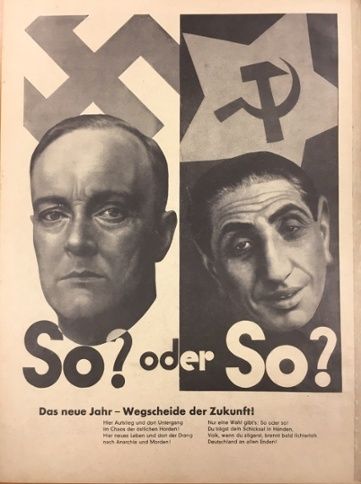 Alfred Flechtheim was the owner of successful galleries in Düsseldorf and Berlin, responsible for sponsoring the emerging careers of artists like Max Beckmann, George Grosz, and other stars of the Weimar era. As the Nazis' power increased in the early 1930s, Flechtheim became a convenient scapegoat. Nazi propaganda newspapers and magazines used Flechtheim's picture with racist captions and slogans long before 1933. Here is one unsettling example (stating "This? Or this?", it is meant to refer to the supposed "choice" faced by Germany in 1933).