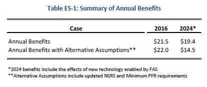 However, the benefits of FAS depend on how FAS and CAS are each defined. Our analysis was based on CAS and FAS specifications that were current in the spring of 2015. But since ancillary service market rules continue to change, we analyzed two sets of alternative assumptions reflecting recent developments. One set of these assumptions increased the benefits of FAS and the other set decreased them. The ERCOT Board recently approved an amendment to CAS that would reduce the average Non-Spinning Reserve procurement from 1,931 MW to 1,464 MW in 2016 and from 2,000 MW to 1,464 MW in 2024. These reductions in CAS requirements reduce the savings attributable to FAS's tighter replacement reserve requirements by $6.4 million in 2016 and $8.4 million in 2024. On the other hand, in mid-September 2015, North American Electric Reliability Corporation (NERC) released new standards that reduced the Minimum PFR requirement from 1,240 MW to 1,143 MW. The Minimum PFR change has a greater effect in FAS than CAS due to FAS's recognition of the equivalency ratio between FFR and PFR resources as well as the removal of the 50% limit on Load Resource participation. PFR procurement savings increase from 140 to 220 MW in 2016, resulting in $6.9 million additional savings, and from 129 to between 207 and 266 MW in 2024, depending on the participation of new technology, resulting in $2.8 to $3.4 million additional annual savings. When both the NSRS and PFR changes are applied together, however, the results are similar to the savings reported in our original analysis.