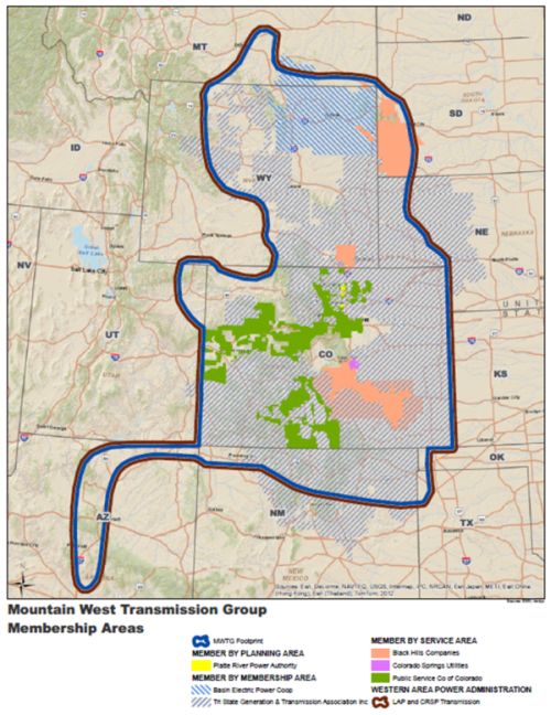 MWTG comprises cooperative, investor-owned, municipal, and federal electricity service providers serving nearly 4.5 million end-use consumers extending from Montana to New Mexico: Basin Electric Power Cooperative, Black Hills Power, Black Hills Colorado Electric Utility, Cheyenne Light Fuel & Power, Colorado Springs Utilities, Platte River Power Authority, Public Service Company of Colorado, Tri-State Generation and Transmission Association, and the Western Area Power Administration's (WAPA) Loveland Area Projects and Colorado River Storage Project. While originally focused on addressing the "rate-pancaking" issues resulting from the nine transmission tariffs that exist within the MWTG footprint, MWTG efforts expanded to consider a common transmission tariff without a wholesale electricity market and RTO membership with both a common tariff and a wholesale market.