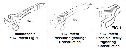 In the author's opinion, the "worst case" scenario would be for a district court to latch onto the "ignoring" language and completely remove functional elements from a claim. So for Richardson, where the court stated that "Richardson's multi-function tool comprises several elements that are driven purely by utility" including "elements such as the handle, the hammerhead, the jaw, and the crowbar . . . ."28 If these elements are "ignored," one could envision the construed claim appearing (at the very least in the minds of fact finders) as follows: