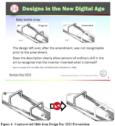 At Design Day 2013, a presentation by the USPTO Design Practice Specialist, Mr. Joel Sincavage, titled "More About the Written Description Requirement of 35 USC 112(a)" caused controversy. USPTO design patent examiners consult with Mr. Sincavage regarding, e.g., whether to make a WDR rejection. The controversy reached a crescendo with the following slide: