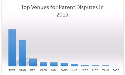 In 2015, nearly 25 percent of all patent cases filed were IPRs, making the USPTO the second busiest patent docket in the country.8 About 40 percent of the IPRs filed in 2015 were directed at patent trolls.9 IPRs have quickly become a favored strategy among technology giants like Apple, Google, Samsung, Microsoft, Intel, and IBM10 because IPRs are often cheaper, faster, and more effective than litigation.11 (As an example, Apple has filed 184 IPRs). The IPR process can be much less expensive (e.g., $300,000 v. $3 million) and at least twice as fast (an average duration of about 17 months from filing to final decision v. 2.5 to 5 years in court) as litigation.12 In addition, for IPR petitions that are granted, the win rate is above 80 percent.13 Based on the above results, the Patent Trial and Appeal Board (PTAB) of the USPTO has become the second busiest patent docket (see graph below):