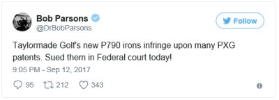 The great Bobby Jones, himself a lawyer, once said that "Competitive golf is played mainly on a five-and-a-half-inch course ... the space between your ears." I don't know if Mr. Jones ever practiced patent law, but the competitive golf equipment game between Parsons Xtreme Golf ("PXG") and TaylorMade Golf is going to be played in federal district court. On Tuesday, September 12, 2017, PXG sued TaylorMade for patent infringement in the U.S. District Court for the District of Arizona just three days before TaylorMade is scheduled to release its new P790 irons. TaylorMade is one of the largest golf club manufacturers (and is in the process of being sold to private equity firm KPS Capital Partners). PXG is a high-end newcomer to the market, launched in 2015 by billionaire Bob Parsons of GoDaddy.com success. Parsons took to Twitter to announce the suit: