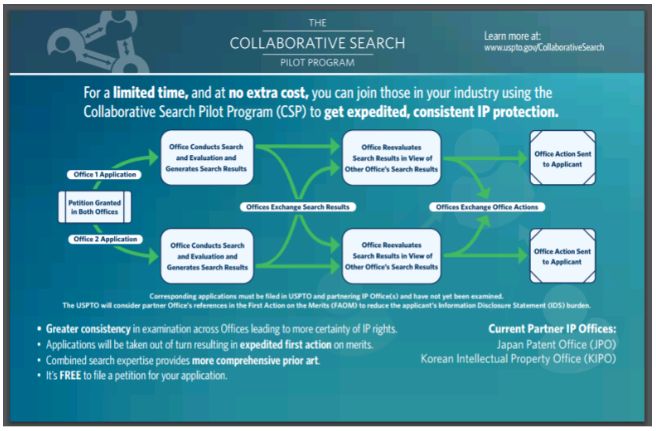 The Expanded CSP commenced November 1, 2017, and will run through at least November 1, 2020. The USPTO, JPO and KIPO participated in the original CSP, and currently are the only "partner" intellectual property offices participating in the Expanded CSP, although the Federal Register Notice contemplates that additional partner offices may join. According to the Federal Register Notice, each partner office will accept up to 400 applications into the program per year.
